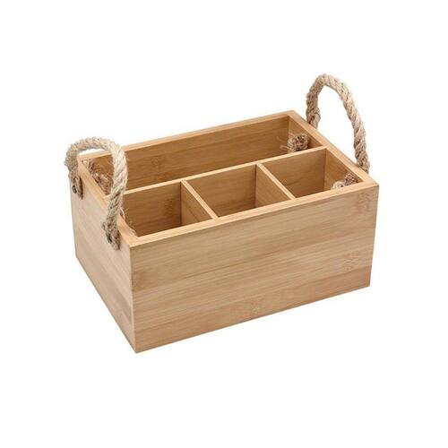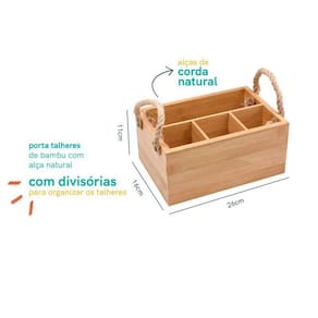 Porta talheres de bambu natural com alca de fibra Esse porta talher de bambu natural foi feito pensando na organização dos talheres de sua cozinha, mas também pode ser usado em outros ambientes para guardar os objetos do seu cotidiano. Benefícios:- madeira de bambu leve e resistente - divisórias para separação dos objetos- alças firmes de corda natural- design clean e moderno, deixa um tom natural em qualquer ambiente. Medidas:- comprimento: 26cm - largura: 11cm - altura: 16cm