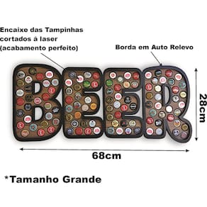Dimensões: 68cm largura x 28cm altura x 1,2cm profundidade Quantidade de tampinhas: 109 unidades Indicações de uso: