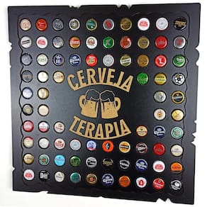 Feito em mdf amadeirado bilaminado de 6mm, tornando a peça bem rústica. Escrita em auto relevo, letras coladas uma a uma. Tampinhas ficam super firmes. Encaixe das tampinhas cortadas á laser, acabamento perfeito. Capacidade para 80 tampinhas Dimensões: 45cm de largura x 45cm de altura x 2cm de profundidade