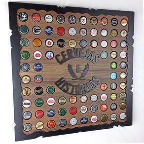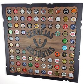 Feito em mdf amadeirado bilaminado de 6mm, tornando a peça bem rústica. Escrita em auto relevo, letras coladas uma a uma. Tampinhas ficam super firmes. Encaixe das tampinhas cortadas á laser, acabamento perfeito. Capacidade para 80 tampinhas Dimensões: 45cm de largura x 45cm de altura x 2cm de profundidade