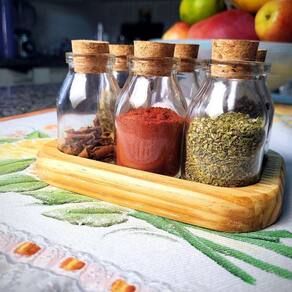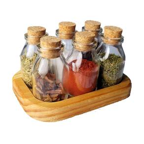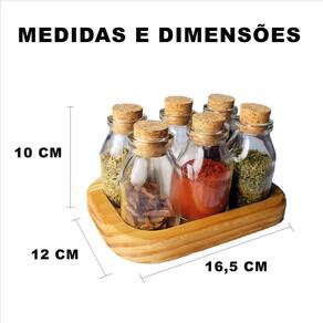 Ele acompanha 6 potes de vidro reforçado o vidro reforçado 60ml com 8cm de altura e 4cm de largura com rolha portuguesa 100% cortiça natural. Ao contrário de outros materiais a rolha e o vidro não oxidam, não amassam e não criam fungos. Tanto a rolha como o vidro podem ser lavados sem preocupações.