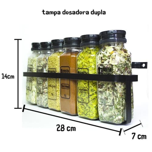 Porta Tempero Condimento Cozinha kit 6 potes com tempero A cozinha ao passar do tempo vem sendo um dos lugares mais importantes da casa, Para deixar ela mais moderna, elegante e prática o porta tempero é a solução, além de Organizar todos os seus temperos e especiarias também os conservam deixando tudo mais Fácil e em sua disposição na hora de cozinhar e arrasar nas receitas Nosso porta tempero é extremamente especial, além de todos os beneficios também pode Acoplar até 3 porta temperos caso queria fazer um upgrade em sua cozinha e ter varios deles, pois É um porta tempero vertical, podendo ser fixado em azulejo, parede, etc. Comprando conosco você terá o melhor atendimento desde antes da compra e até o pós-compra, CONTEÚDO NA EMBALAGEM - 1 suporte de tempero de ferro na cor preta - 1 par de parafuso/bucha para fixação - 6 potes de tempero de plástico com tampa dosadora dupla giratória - 1 barra para fixação do suporte - 6 tipos de temperos chimichurri sem pimenta, lemon pepper, salsa/cebola/alho, tempero gaúcho, edu guedes e páprica defumada INFORMAÇÕES IMPORTANTES SUPORTE: É de ferro e pintado com a tecnologia eletrostática, dando A ele melhor acabamento. -28cm de comprimento, 14cm de altura e 7cm de largura POTES : são de plástico tipo PET com parede grossa super-resistente -13,5 cm de altura -220ml -O produto acompanha temperos R: Sim, todos eles acompanham temperos ou especiarias conforme a descrição, todos lacrados e embalados. -posso utilizar ventosa para fixar o suporte R: você até consegue improvisar e usar ele com venstosas, porém vale ressaltar que não acompanha as ventosa E esse modelo de porta tempero foi feito para utilizar a barra fixa com parafuso e bucha. -qual o material do porta tempero R: É composto por um suporte de ferro com pintura eletrostática de altíssima qualidade e Os 6 potes de temperos são de plástico tipo PET com parede grossa, super-resistente -qual o Tempo para fazer o envio Marca: Armazém Do Brasil