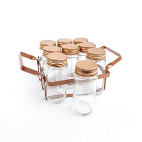 O suporte de tempero é feito de ferro com acabamento em pintura eletrostática de alta qualidade. Os 9 potes de tempero são feitos de plástico resistente, com tampa rosca metálica rose gold. Cada pote possui capacidade para 100ml, ideal para armazenar seus temperos favoritos.