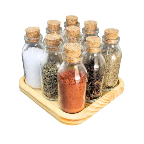 espessura e cor: disponível com 18 mm de espessura na cor natural, com aplicação de óleo mineral. Ele acompanha 9 potes de vidro reforçado 60ml com 8cm de altura e 4cm de largura com rolha portuguesa 100% cortiça natural. Ao contrário de outros materiais a rolha e o vidro não oxidam, não amassam e não criam fungos. Tanto a rolha como o vidro podem ser lavados sem preocupações.