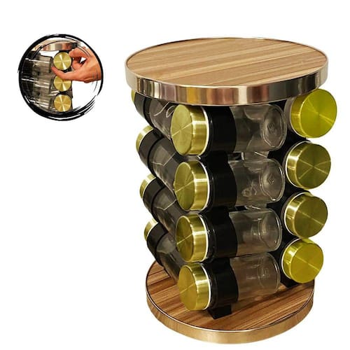 Características . Possui base giratória: visualize todos os temperos com um simples giro; . Material base: Metal, Polietileno e tampo com acabamento de madeira; . Material potes: Vidro e Metal . Possui 16 Potes com 75g para armazenagem de temperos (cada pote) Marca: Tesla Store
