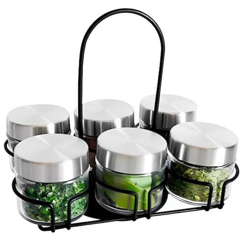 O kit porta tempero, é composto por 6 potes de vidro com capacidade de aproximadamente 100mL e 1 suporte giratório com design aramado e na cor preta. Para que você possa armazenar suas especiarias, tempero e condimentos preferidos e tê-los sempre por perto no momento em que estiver cozinhando ou servindo seus convidados, e sem deixar de lado a decoração de sua cozinha, tornando o ambiente ainda mais agradável.