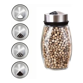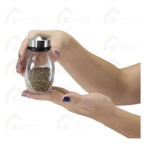 Conjunto organizador de condimentos composto por suporte central giratório e seis recipientes. O produto é fabricado em aço inox, vidro e polipropileno (PP). Cada frasco possui capacidade volumétrica de 120ml e tampa com sistema de tripla furação para controle de saída do conteúdo (sal, grãos ou especiarias). A base rotativa permite o movimento circular dos frascos ao redor do eixo central. Medidas: 18,7cm de altura por 15,7cm de diâmetro. Peso aproximado de 1,1kg.