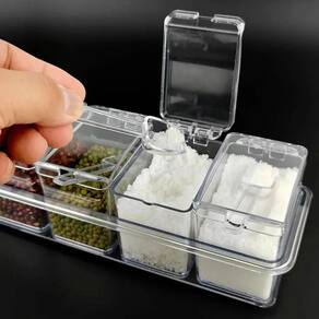 Conteúdo da embalagem: 04 Potinhos de acrílico para armazenar condimentos 01 Base para colocar os porta condimentos 04 Colheres para facilitar o uso dos potinhos Marca: Não Informado