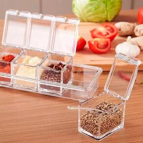 Ele possui 4 potinhos de acrílico transparente que já vão acompanhados de 4 colheres para facilitar o uso na cozinha.