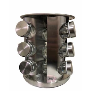 Características: - contém 12 potes de vidro e 01 suporte com a base giratória em aço inox. - estrutura reforçada (não amassa ou deforma); - extremamente leve, basta acompanhar o vídeo e reparar na leveza que giramos com o dedo mindinho (dedinho); - design inovador e moderno; - melhor custo benefício do mercado; - altura (suporte): 21 cm; - diâmetro (suporte): 18 cm; - altura (pote): 9 cm; - diâmetro (pote): 4 cm;