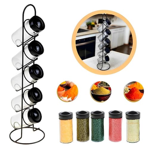 Com nosso porta-temperos, você terá todos os seus condimentos favoritos sempre à mão e perfeitamente organizados. Seus 5 potes de vidro permitem armazenar diferentes tipos de temperos, mantendo-os frescos e acessíveis. O suporte material do suporte garante estabilidade e um design elegante.