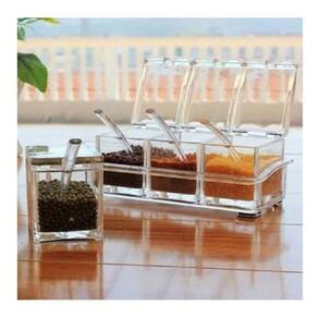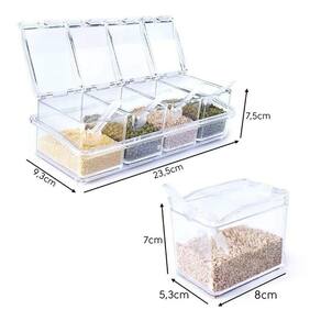 Ele possui 4 potinhos de acrilico transparente que já vão acompanhados de 4 colheres para facilitar o uso na cozinha.