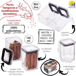 Mantenha seus temperos organizados com praticidade e um toque de elegância com este porta-condimentos com base suporte. O kit é composto por 2 potes com capacidade de 160ml cada, fabricados em poliestireno 100% transparente e livre de BPA, garantindo segurança no uso com alimentos e facilitando a visualização do conteúdo. As tampas herméticas ajudam a conservar melhor os aromas e sabores dos condimentos. A base inclinada proporciona um visual moderno e funcional, ideal para uso tanto no balcão quanto dentro da gaveta. Material: poliestireno Itens inclusos: - 2 porta condimentos com capacidade para 160ml. Comprimento: 5,9 cm / Largura: 5,9 cm / Altura: 8,3 cm - 1 suporte. Comprimento 13,1 cm / Largura: 13,6 cm / Altura: 7,4 cm
