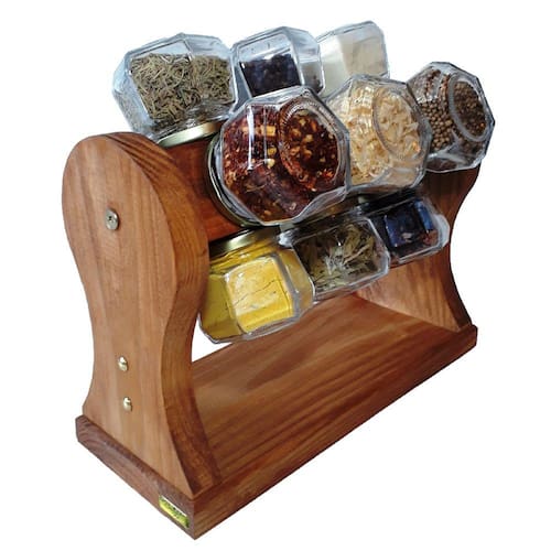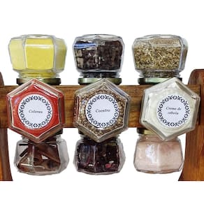 Especificações do produto:-12 unidades de vidros sextavados com capacidade de 170 ml cada pote.-Cor natural-Madeira central com eixo giratório.-Fechamento modelo rosca com tampa em metal.-Identificação adesiva com os nomes do temperos-Acompanha diversos tipos de temperosDimensões: -Altura 24cm 28cm área de giro -Comprimento 33cm-Largura 14cmConteúdo da embalagem:- 01 Porta Temperos modelo giratório com 12 potes de vidro.- Acompanha diversos temperos.