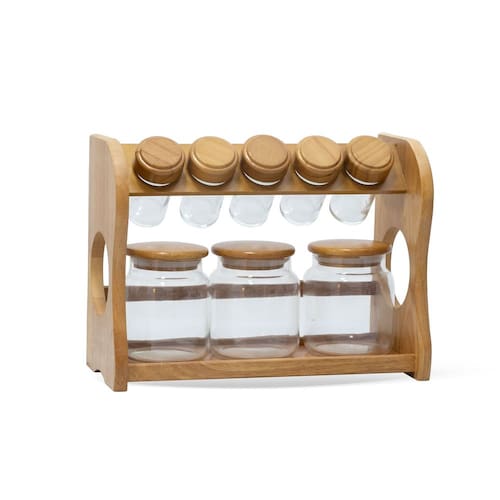 Os potes de vidro com tampas herméticas preservam o aroma e o sabor dos alimentos, enquanto o suporte de madeira adiciona um toque acolhedor e moderno à decoração. Uma escolha funcional e charmosa para deixar sua cozinha mais organizada e estilosa.