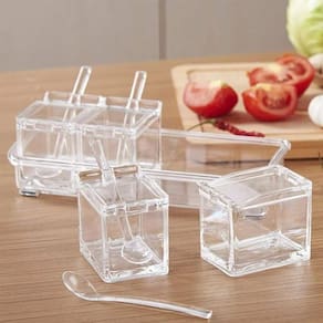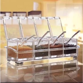 Porta Temperos Em ACRILICO com Colher 4 Partes Ideal para você que quer manter sua cozinha limpa e organizada, sem deixar os temperos e condimentos espalhados. Com tamanho ideal para suas necessidades. São 4 potes em acrílico destacáveis com tampas de tipo prensa e equipadas com colheres. Fácil de procurar esses ingredientes escondidos.