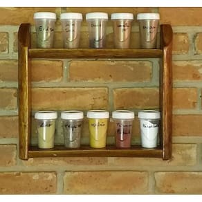 Porta Temperos Em Madeira Rústica Deixe seus temperos organizado de uma maneira incrível e prática com este lindo porta tempero de parede. Fabricado em Madeira Maciça de eucalipto e acabamento em verniz Medidas: 28cm largura x 30cm altura x 8cm profundidade Ficha técnica - Cor: Marrom