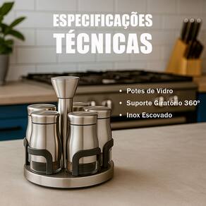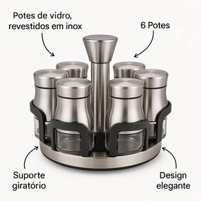 Suporte Giratório Porta Condimentos em Vidro e Inox – Kit com 6 Unidades Transforme sua cozinha com mais organização, praticidade e um toque de sofisticação!Esse elegante suporte giratório é ideal para armazenar os principais temperos do dia a dia, mantendo tudo sempre à mão durante o preparo das suas receitas.