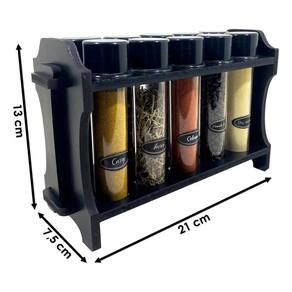Conteúdo da embalagem. - 01 suporte de madeira mdf - 10 tubetes plástico translúcido - 10 tampas plástico na cor preta. - 24 adesivos com os nomes de alguns temperos já impressos. - o produto não acompanham os temperos.