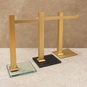 O porta toalha de bancada da linha Ouro Fosco representa o máximo em sofisticação ao seu banheiro. Tem formas retas e planas, cuja referência vem de linhas de design consagrado. O Acabamento Ouro Fosco traz na sua essência sais de ouro 24K e isso se traduz em uma tonalidade requintada e luxuosa ao seu banheiro. Para você que é exigente e elegante, essa é a escolha perfeita! É produzido em metais de altíssima qualidade o que garante um produto de maior durabilidade. Possui modelos de bases: Inox e vidro preto ou incolor.