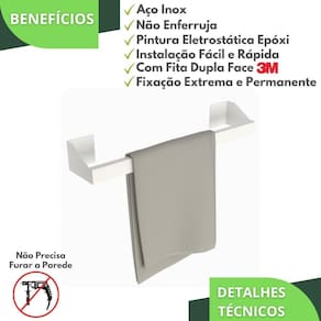 Com um design minimalista, o preferido pelos arquitetos nos últimos tempos, o Porta Toalha de Rosto é fabricado utilizando aço inox com acabamento em Pintura Eletrostática Epóxi proporcionando maior durabilidade, resistência e garantindo que não ocorrerá oxidação nem ferrugem.