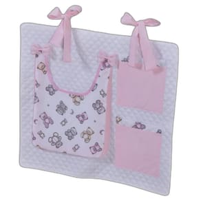 Porta Treco e Fralda Organizador Quarto de Bebê Menino Menina 1 Peça Com Laço Cor: Urso rosa O porta fraldas é ideal pra ter sempre a mão os produtos mais no dia a dia com seu bebê. Nosso porta fralda/treco tem 2 bolsos menores, onde podem ser colocados produtos pequenos, e 1 bolso maior pra colocar as fraldas, roupas, toalhas ou itens maiores. Praticidade e decoração em um só produto. Sugestão de uso: Pendurado em varão ou no berço Contém na embalagem: 1 porta fraldas Medidas: 64cm larg x 54cm alt - 1 bolso 37cm alt x 27cm larg x 5cm prof - 2 bolsos 21cm alt x 18cm larg Composição: Matelado de microfibra 100% poliéster Tecido estampado e liso percal 180 fios 100% algodão - Foto ilustrativa, tonalidade da cor pode variar um pouco no produto real Produtos fabricados em Ibitinga-SP, a Capital Nacional do Bordado e do Enxoval. Marca: Não Informado
