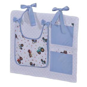 Porta Treco e Fralda Organizador Quarto de Bebê Menino Menina 1 Peça Com Laço Cor: Trator azul claro O porta fraldas é ideal pra ter sempre a mão os produtos mais no dia a dia com seu bebê. Nosso porta fralda/treco tem 2 bolsos menores, onde podem ser colocados produtos pequenos, e 1 bolso maior pra colocar as fraldas, roupas, toalhas ou itens maiores. Praticidade e decoração em um só produto. Sugestão de uso: Pendurado em varão ou no berço Contém na embalagem: 1 porta fraldas Medidas: 64cm larg x 54cm alt - 1 bolso 37cm alt x 27cm larg x 5cm prof - 2 bolsos 21cm alt x 18cm larg Composição: Matelado de microfibra 100% poliéster Tecido estampado e liso percal 180 fios 100% algodão - Foto ilustrativa, tonalidade da cor pode variar um pouco no produto real Produtos fabricados em Ibitinga-SP, a Capital Nacional do Bordado e do Enxoval. Marca: Não Informado