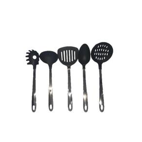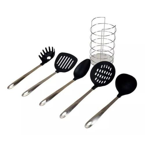 Kit Utensílios Cabo Inox, Preto 5 Peças Utensílios com suporte O Kit 5 utensílios e pote Plastico Gala é um charmoso conjunto de utensílios de cozinha que contém 1 colher de arroz, 1 concha, 1 escumadeira e uma espátula. É um produto ecológico e higiênico, pois o plastico tem propriedades antibactericidas. Quantidade: 5 peças Composição: plastico e aço inox Cor: Preto Descrição e Número de Peças: 1 Escumadeira plastico Cabo Inox 1 Pegador de Massas plastico Cabo Aço Inox 1 Concha plastico Cabo Aço Inox 1 Colher plástico Cabo Aço Inox 1 Espátula plastico Cabo Aço Inox Ean: 7899535000905
