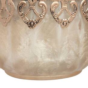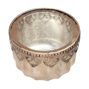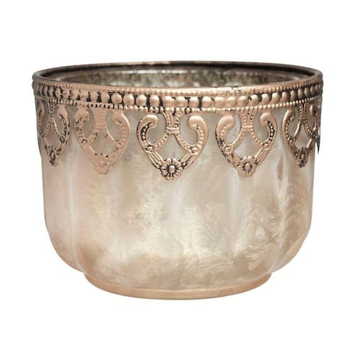 O Porta Vela Orioni tem 11 cm e é produzido em vidro com acabamento que remete à madre pérola e metal, com detalhes de arabescos na borda.