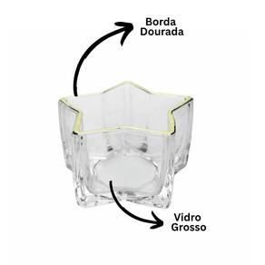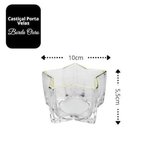 Com design moderno e delicado, seu formato de estrela em vidro transparente espesso com acabamento na borda em dourado metálico agrega sofisticação e brilho sutil ao ambiente. Ideal para velas pequenas de até 5cm de diâmetro, pode ser utilizado sobre bandejas decorativas, mesas postas, aparadores ou como destaque em centros de mesa.