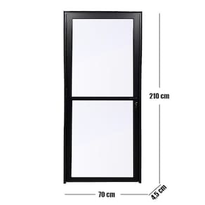 Feita com alumínio de alta qualidade e conta com pintura eletrostática preta. A porta possui uma folha de vidro, acompanha batente, maçaneta, par de chave e vai pronta para ser instalada.