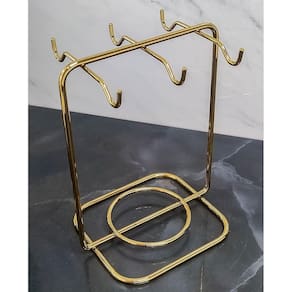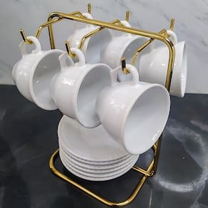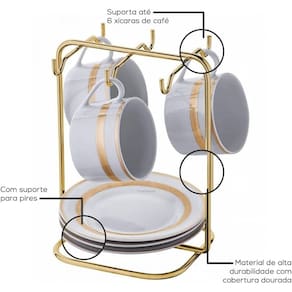 Organize seu cantinho do café com charme e sofisticação. Possui suporte para xícaras e base para pires, com estrutura resistente e acabamento dourado que valoriza a decoração do ambiente.