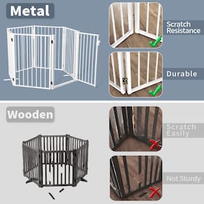 - Estrutura resistente e estável: o material todo em metal dá peso suficiente para manter seu próprio equilíbrio. O suporte de pé de metal atualizado e a borracha antiderrapante na parte traseira garantem a estabilidade do portão independente para cães