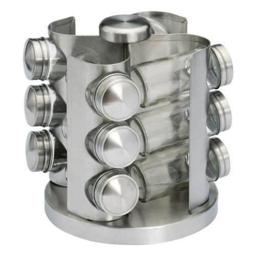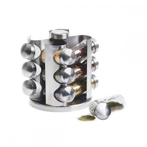 Portatemperos da Casa Ambiente composto por 12 potes fabricados em vidro resistente e tampas em aço inox de alta qualidade. Acompanha suporte giratório também produzido em aço inox, de mais praticidade e segurança durante o manuseio. Possui design moderno e acabamento fosco, composição cheia de estilo para integrar a decoração de sua cozinha. Escolha certa para levar mais funcionalidade ao seu dia a dia e te auxiliar no preparo de receitas deliciosas Pode armazenar sal, pimentas, ervas finas, curry e mais uma variedade de temperos moídos. Composição 12 Potes de vidro Altura 9.5 cm Diâmetro 4.3 cm 01 Suporte Altura 20 cm Diâmetro 18 cm