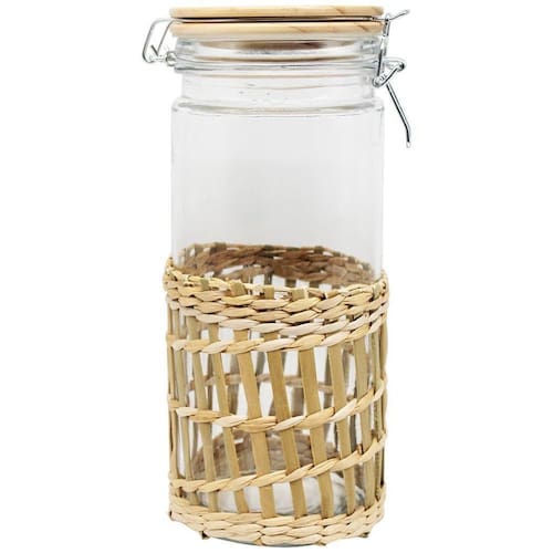 Com seu acabamento em fibra natural e tampa de bambu hermética, este pote adiciona um toque de charme rústico à sua cozinha ou em bancadas, complementando a decorações.