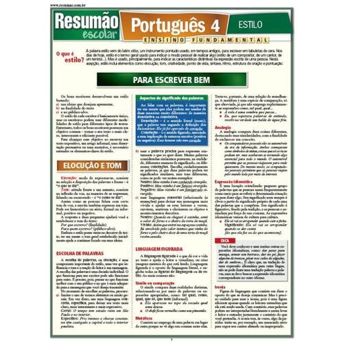 Português 4 é um guia feito para ajudar o aluno a escrever bem. O que é estilo, elocução e tom. Como deve ser feita a escolha das palavras e os tipos de linguagem. Como as palavras se organizam no texto, o ritmo e os tipos de período que se pode adotar. No final, dicas sobre o uso apropriado da pontuação para deixar o texto claro e fácil de ser entendido.