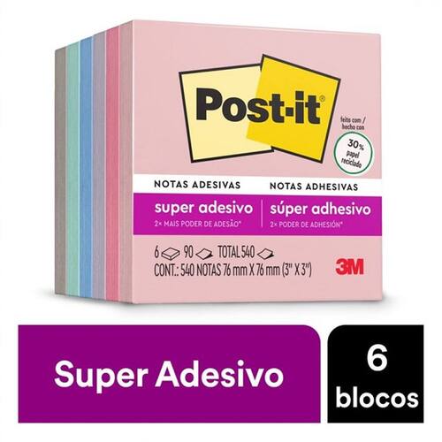 Bloco de notas super adesivas, possuindo 2x mais adesão do que o bloco Post-it original. Ideal para colar em superfícies verticais. As notas adesivas Post-it tamanho 7,6 cm x 7,6 cm são ideais para anotações e recados.