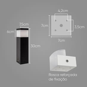 ESPECIFICAÇÕES TÉCNICAS DO POSTE: Cor: Preto Aceita lâmpadas LED, Fluorescente ou Incandescente. Material: Alumínio e Policarbonato Bivolt: 110/220 v Soquete: E-27 (Rosca padrão) Tamanho: 30 cm de Altura. Dimensões: 7,5 cm de largura x 7,5 cm de profundidade Utiliza 1 lâmpada E-27