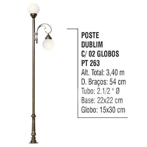Poste Colonial Dublim Para Jardim Alumínio 02 Globos 3,40m Poste para jardim, ideal para condomínios, jardins, praças, parques, estacionamentos, vias urbanas e áreas externas em geral. Pode ser utilizada em regiões de praianas, pois não sofre ação da maresia. Ótimo custo benefício. Possui Alongamento para reator. Características: Material: Alumínio Fundido e Tubo, Globo em Vidro. Cores disponíveis: Preta, Branca, Dourado Craqueado. Favor informar no campo de mensagem a cor desejada. Se o comprador não se prounciar quanto a cor, será enviada a cor padrão Dourado Craqueado. Medidas: Altura total: 3,40m. Diâmetro dos Braços: 54cm. Base: 22x22cm. Globo: 15x30cm. Tubo: 2.1/2". Poste sem lâmpadas. Lâmpadas Lâmpada Compatível E-27. (NÃO INCLUSA). Itens Inclusos: 01 Poste Colonial Dublim Para Jardim Alumínio 02 Globos 3,40m Código: PT263. ATENÇÃO - A instalação é de inteira responsabilidade do comprador. undefined
