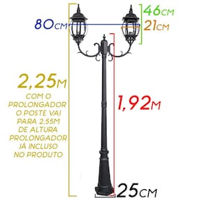 O Poste Colonial é um clássico que nunca sai de moda. Belo, imponente e muito versátil pode ser instalado em grandes ou pequenos Jardins, tornando o ambiente agradável e elegante. Este produto é produzido em alumínio injetado que não enferruja e garante perfeito acabamento da peça. Por isso também é indicada para áreas externas e internas, inclusive litorâneas.