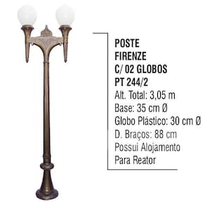 Poste Colonial Firenze P/ Jardim de Alumínio 02 Globo 3,05m Poste para jardim, ideal para condomínios, jardins, praças, parques, estacionamentos, vias urbanas e áreas externas em geral. Pode ser utilizada em regiões de praianas, pois não sofre ação da maresia. Ótimo custo benefício. Possui Alongamento para reator. Características: Material: Base em Alumínio Fundido e Globo em Polietileno. Cores disponíveis: Preto Brilhante, Branco, Dourado Craqueado, Dourado Pátina, Ouro Velho, Preto Fosco, Amarelo, Vermelho, Azul, Marro, Prata Craqueado, Grafite e Verde Musgo Texturizado. Favor informar no campo de mensagem a cor desejada. Todas as cores citadas estão à mostra como imagem terciária do anúncio. Se o comprador não se pronunciar quanto a cor, será enviada a cor padrão Dourado Craqueado. Medidas: Altura total: 3,05m. Diâmetro dos Braços: 88cm. Base: 35cm. Globo em Plástico: 30cm. Poste sem lâmpadas. Lâmpada Compatível: E-27. (NÃO INCLUSA). Itens Inclusos: 01 Poste Colonial Firenze P/ Jardim de Alumínio 02 Globo 3,05m Código: PT244/2. ATENÇÃO - A instalação é de inteira responsabilidade do comprador.