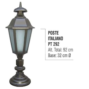 Poste Colonial Italiano Para Jardim em Tubo de Alumínio 92cm Poste para jardim, ideal para condomínios, jardins, praças, parques, estacionamentos, vias urbanas e áreas externas em geral. Pode ser utilizada em regiões de praianas, pois não sofre ação da maresia. Ótimo custo benefício. Possui Alongamento para reator. Características: Material: Tubo de Alumínio e Vidro. Cores disponíveis: Preto Brilhante, Branco, Dourado Craqueado, Dourado Pátina, Ouro Velho, Preto Fosco, Amarelo, Vermelho, Azul, Marrom, Prata Craqueado, Grafite e Verde Musgo Texturizado. Favor informar no campo de mensagem a cor desejada. Todas as cores citadas estão à mostra como imagem terciária do anúncio. Se o comprador não se pronunciar quanto a cor, será enviada a cor padrão Dourado Craqueado. Medidas: Altura total: 92cm. Base: 32cm. Poste sem lâmpadas. Lâmpada Compatível: E-27. (NÃO INCLUSA). Itens Inclusos: 01 Poste Colonial Italiano Para Jardim em Tubo de Alumínio 92cm Código: PT292. ATENÇÃO - A instalação é de inteira responsabilidade do comprador.Poste Colonial Italiano Para Jardim em Tubo de Alumínio 92cm Poste para jardim, ideal para condomínios, jardins, praças, parques, estacionamentos, vias urbanas e áreas externas em geral. Pode ser utilizada em regiões de praianas, pois não sofre ação da maresia. Ótimo custo benefício. Possui Alongamento para reator. Características: Material: Tubo de Alumínio e Vidro. Cores disponíveis: Preto Brilhante, Branco, Dourado Craqueado, Dourado Pátina, Ouro Velho, Preto Fosco, Amarelo, Vermelho, Azul, Marrom, Prata Craqueado, Grafite e Verde Musgo Texturizado. Favor informar no campo de mensagem a cor desejada. Todas as cores citadas estão à mostra como imagem terciária do anúncio. Se o comprador não se pronunciar quanto a cor, será enviada a cor padrão Dourado Craqueado. Medidas: Altura total: 92cm. Base: 32cm. Poste sem lâmpadas. Lâmpada Compatível: E-27. (NÃO INCLUSA). Itens Inclusos: 01 Poste Colonial Italiano Para Jardim em Tubo de Alumínio 92cm Código: PT292. ATENÇÃO - A instalação é de inteira responsabilidade do comprador.