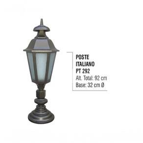 Poste Colonial Italiano Para Jardim em Tubo de Alumínio 92cm Poste para jardim, ideal para condomínios, jardins, praças, parques, estacionamentos, vias urbanas e áreas externas em geral. Pode ser utilizada em regiões de praianas, pois não sofre ação da maresia. Ótimo custo benefício. Possui Alongamento para reator. Características: Material: Tubo de Alumínio e Vidro. Cores disponíveis: Preto Brilhante, Branco, Dourado Craqueado, Dourado Pátina, Ouro Velho, Preto Fosco, Amarelo, Vermelho, Azul, Marrom, Prata Craqueado, Grafite e Verde Musgo Texturizado. Favor informar no campo de mensagem a cor desejada. Todas as cores citadas estão à mostra como imagem terciária do anúncio. Se o comprador não se pronunciar quanto a cor, será enviada a cor padrão Dourado Craqueado. Medidas: Altura total: 92cm. Base: 32cm. Poste sem lâmpadas. Lâmpada Compatível: E-27. (NÃO INCLUSA). Itens Inclusos: 01 Poste Colonial Italiano Para Jardim em Tubo de Alumínio 92cm Código: PT292. ATENÇÃO - A instalação é de inteira responsabilidade do comprador.Poste Colonial Italiano Para Jardim em Tubo de Alumínio 92cm Poste para jardim, ideal para condomínios, jardins, praças, parques, estacionamentos, vias urbanas e áreas externas em geral. Pode ser utilizada em regiões de praianas, pois não sofre ação da maresia. Ótimo custo benefício. Possui Alongamento para reator. Características: Material: Tubo de Alumínio e Vidro. Cores disponíveis: Preto Brilhante, Branco, Dourado Craqueado, Dourado Pátina, Ouro Velho, Preto Fosco, Amarelo, Vermelho, Azul, Marrom, Prata Craqueado, Grafite e Verde Musgo Texturizado. Favor informar no campo de mensagem a cor desejada. Todas as cores citadas estão à mostra como imagem terciária do anúncio. Se o comprador não se pronunciar quanto a cor, será enviada a cor padrão Dourado Craqueado. Medidas: Altura total: 92cm. Base: 32cm. Poste sem lâmpadas. Lâmpada Compatível: E-27. (NÃO INCLUSA). Itens Inclusos: 01 Poste Colonial Italiano Para Jardim em Tubo de Alumínio 92cm Código: PT292. ATENÇÃO - A instalação é de inteira responsabilidade do comprador.