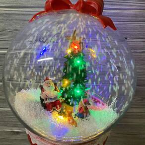 No topo, um belíssimo globo com cenário natalino, luzes cintilantes e neve flutuante que hipnotiza e encanta a todos.