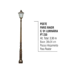 01 Poste Paris Maior P/ Jardim de Alumínio 01 Luminária 3,90m