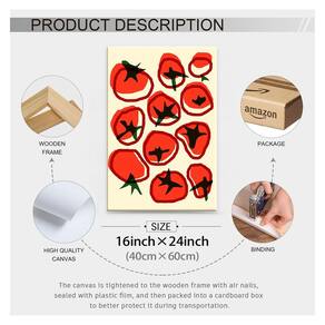 Decorar as paredes da cozinha com alguns pôsteres coloridos de arte de comida pode adicionar vitalidade e calor a todo o espaço. Obras de arte com tema de tomate, coloridas e diversificadas em forma, mas também evocam as belas associações das pessoas com ingredientes frescos. A forma vermelha brilhante e volumosa dos tomates simbolizam saúde e delícias, o que pode estimular o apetite. Resumindo, escolher alguns pôsteres coloridos de arte com tema de tomate pode não apenas melhorar o efeito visual da cozinha, mas também inspirar nossa inspiração culinária, tornando cada refeição um prazer. Criar uma cozinha cheia de arte e vida é realmente uma boa maneira de melhorar a qualidade da vida familiar - Cartazes de cozinha: o tamanho do pôster fofo é de 40,6 x 61 cm, esta decoração de parede de comida é embrulhada e esticada sobre moldura de madeira, para criar um efeito 3D imersivo que faz a arte parecer ótima - Cartazes duráveis e de alta qualidade: arte de parede para cozinha Use tinta de proteção ambiental de alta qualidade, não desbota facilmente, cores vivas, à prova d'água, resistente a UV, sem odor. Arte de parede divertida adicionará um toque de estilo e personalidade às suas paredes - Arte de parede de comida: paredes de cozinha com alguns pôsteres coloridos de arte de comida podem adicionar vitalidade e calor a todo o espaço. Pode não apenas mostrar personalidade, mas também injetar vitalidade e inspiração no espaço. A arte de parede moderna fornece decoração para cozinha, sala de jantar, bar, dormitório, sala de estar, quarto, apartamento, hotel, escritório - Presentes divertidos: obras de arte com tema de tomate, coloridas e diversificadas em formas, mas também evocam belas associações das pessoas com ingredientes frescos. Seja dado como presente de aniversário, Natal, Natal, inauguração de casa ou qualquer outra ocasião especial, a arte de parede de frutas surpreenderá e encantará o destinatário - Serviço pós-venda: valorizamos muito sua experiência de compra, se você tiver algum problema com os pôsteres de comida. Você pode entrar em contato conosco por e-mail na primeira vez. Esperamos resolver quaisquer problemas que você possa encontrar de forma rápida e eficiente