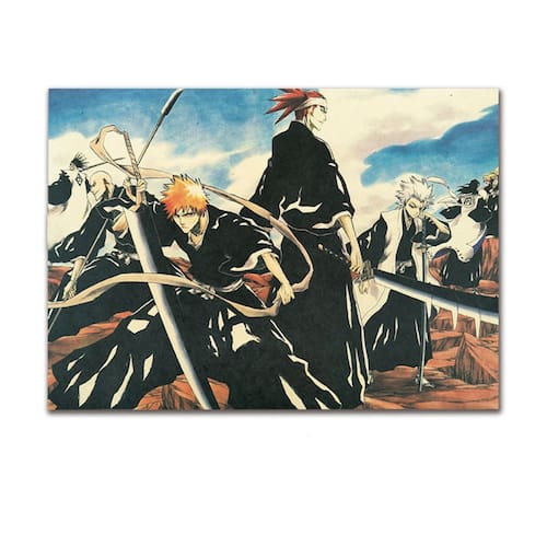 Tamanho: 51,5 x 36 cm Peso: 160 g Material: papel Embalagem: 1 x pôster Esta pintura de pôster de anime é inspirada em Bleach e apresenta Ichigo Kurosaki com Renji Abarai, Toshiro Hitsugaya e outros Soul Reapers, mostrando suas espadas e espírito de luta heróico em obras de arte dinâmicas. Impresso em papel kraft vintage, o pôster tem um efeito texturizado retrô que aprimora o estilo clássico de anime, tornando-o adequado para quartos, salas de jogos, estúdios, cafés, escritórios e interiores temáticos. O design sem moldura de 51,5 x 36 cm mantém o pôster leve e simples de pendurar ou substituir, ajudando você a refrescar facilmente a decoração da parede e adicionando uma poderosa atmosfera de anime ao seu espaço. Este pôster decorativo de arte de parede é uma excelente opção de presente para fãs de Bleach e amantes de anime, perfeito para aniversários, feriados, comemorações ou coleções pessoais, inspirando imaginação e paixão. Cada pacote inclui 1 pôster pesando cerca de 160g. O material de papel durável é fácil de enrolar, armazenar e exibir, oferecendo um valor decorativo duradouro para ambientes domésticos e comerciais.
