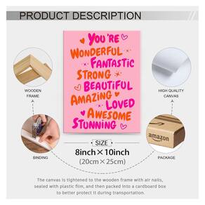Transforme seu espaço com nossos pôsteres de afirmações positivas de lembrete diário projetados para inspirar e elevar todos os dias. Feitas com tela de alta qualidade, nossas impressões de parede oferecem cores vibrantes e durabilidade excepcional. A decoração estética de parede é perfeita para qualquer quarto, dormitório ou escritório, integrando-se perfeitamente com estilos maximalistas e minimalistas. - Os tamanhos dos pôsteres com citação inspiradora You Are Doing Amazing são: 20 x 25 cm, Que sorte somos nós a decoração artística ser embrulhada e esticada sobre moldura de madeira, pronta para ser pendurada diretamente. - Decoração de quarto moderno: com excelente combinação estética inspiradora de cores e design de padrão, é fácil misturar e combinar diferentes estilos de casa para criar uma vibração acolhedora em qualquer espaço, como sala de estar, quarto, cozinha, banheiro, sala de jantar, hotel de escritório, bar de restaurante ou qualquer outra ocasião. - Decoração de parede elegante: arte minimalista de decoração de parede moderna usa tinta ecológica de alta qualidade e tela de alta qualidade, e use as melhores impressoras da indústria para pulverização em camadas, as cores são delicadas e a transição é natural. Traz prazer visual. - Presentes perfeitos: os pôsteres rosa modernos são um presente ideal para aniversários, inaugurações de casa, feriados ou qualquer evento especial. Que sorte é a arte de parede adiciona um toque chique a qualquer parede, trazendo uma mistura única de vibrações vintage e modernas ao seu espaço. - Serviço pós-venda: Valorizamos muito sua experiência de compra, se você tiver algum problema com o pôster rosa de decoração de quarto comprado, por e-mail na primeira vez. Esperamos resolver quaisquer problemas que você possa encontrar de forma rápida e eficiente.