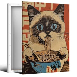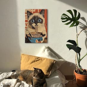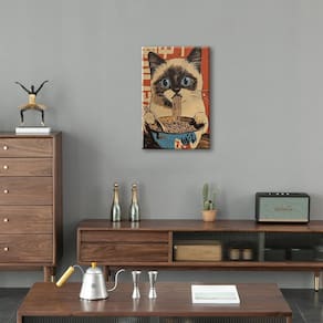 - Pôster fofo de gato japonês comendo macarrão: Esta estampa adorável apresenta um gato gordinho desfrutando feliz de macarrão em um estilo de inspiração japonesa, adicionando um toque cultural único à sua cozinha ou área de jantar
