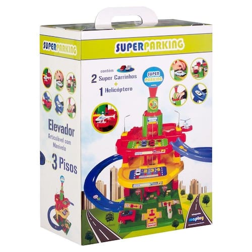 O Super Parking da Maptoy é um brinquedo interativo que permite total interacao da crianca. Ele simula praticas cotidianas de um grande estacionamento, permitindo transitar entre as pistas com o carrinho, estacionar, abastecer nas bombas de gasolina, subir e descer com o automovel em um grande elevador, e muitas outras funcoes muito divertidas. E para a brincadeira ficar ainda mais completa, vem com dois super carrinhos e um helicóptero. Idade recomendada: 3 anos. Cor: Colorido. Imagens meramente ilustrativas. Conteúdo da Embalagem: 01 Super Parking, 02 carrinhos e 01 helicóptero. Dimensões Aprox. do produto (cm) AxLxC: 82x55x105 cm. Dimensões Aprox. da embalagem (cm) AxLxC: 56x22x42 cm. Peso Aprox. da embalagem com produto (kg): 3,100 kg. Certificação do INMETRO: CEBRI/IQB 6159 NM 300/2002.